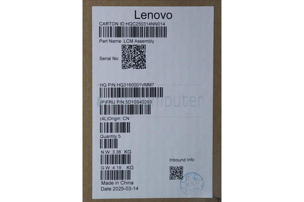 Lenovo 5D10S40293 Lenovo LCD Module, 14", WUXGA, Touch, Glare, IPS, 300nit, 45%NTSC, Luna Grey