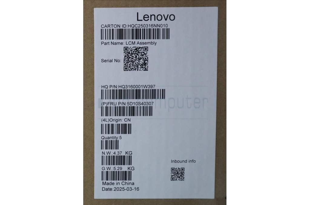 Lenovo 5D10S40307 Lenovo LCD Module, 16", WUXGA, Touch, Glare, IPS, 300nit, 45%NTSC, Luna Grey